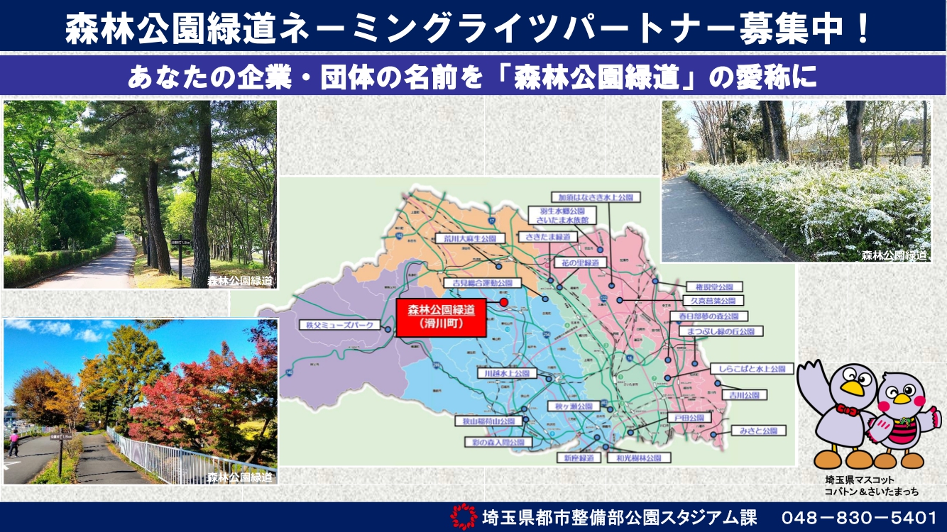 埼玉県では現在、「森林公園緑道」のネーミングライツパートナーを募集中です。